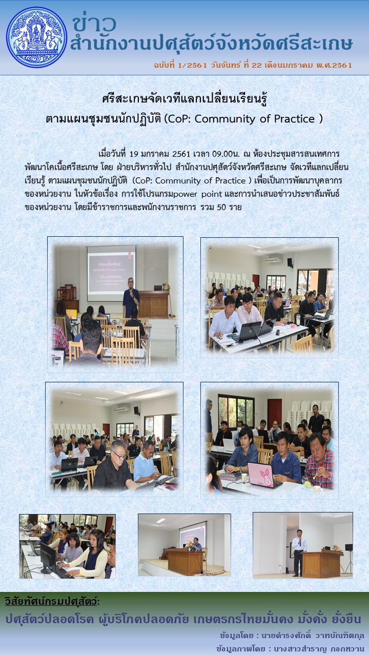 - โครงการพัฒนาที่โดดเด่นของหน่วยงาน ด้วยวิธีการจัดตั้งชุมชนนักปฏิบัติ (COP) เรื่องการนำเสนอผลงานโดยโปรแกรม Power Point และการนำเสนอข่าวประชาสัมพันธ์ของหน่วยงาน