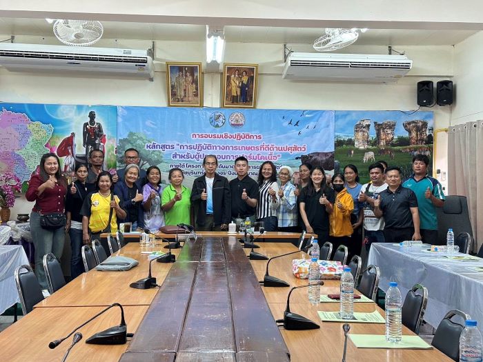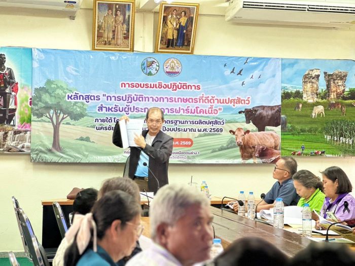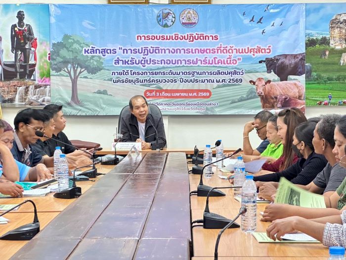 วันที่ 3 เมษายน 2569 นายพีรศักดิ์ ไชยชนะแสง ปศุสัตว์จังหวัดชัยภูมิ มอบหมายให้กลุ่มยุทธศาสตร์และสารสนเทศการปศุสัตว์ จัดอบรมเชิงปฏิบัติการ หลักสูตร การปฏิบัติทางการเกษตรที่ดีด้านปศุสัตว์ สำหรับผู้ประกอบการฟาร์มโคเนื้อภายใต้โครงการยกระดับมาตรฐานการผลิตปศุสัตว์นครชัยบุรินทร์ครบวงจร ปีงบประมาณ พ.ศ. 2569 การอบรมครั้งนี้มีวัตถุประสงค์เพื่อส่งเสริมองค์ความรู้ด้านการปฏิบัติทางการเกษตรที่ดีด้านปศุสัตว์ให้แก่เกษตรกร พร้อมยกระดับมาตรฐานการผลิตโคเนื้อให้มีคุณภาพ ได้มาตรฐาน และสามารถแข่งขันในตลาดได้อย่างยั่งยืน
