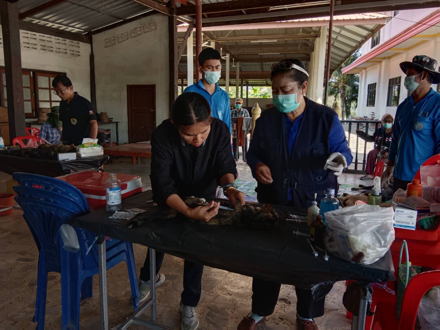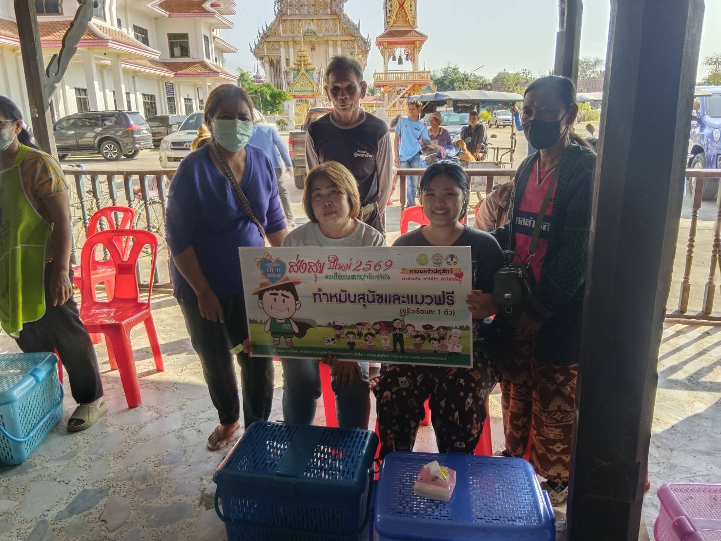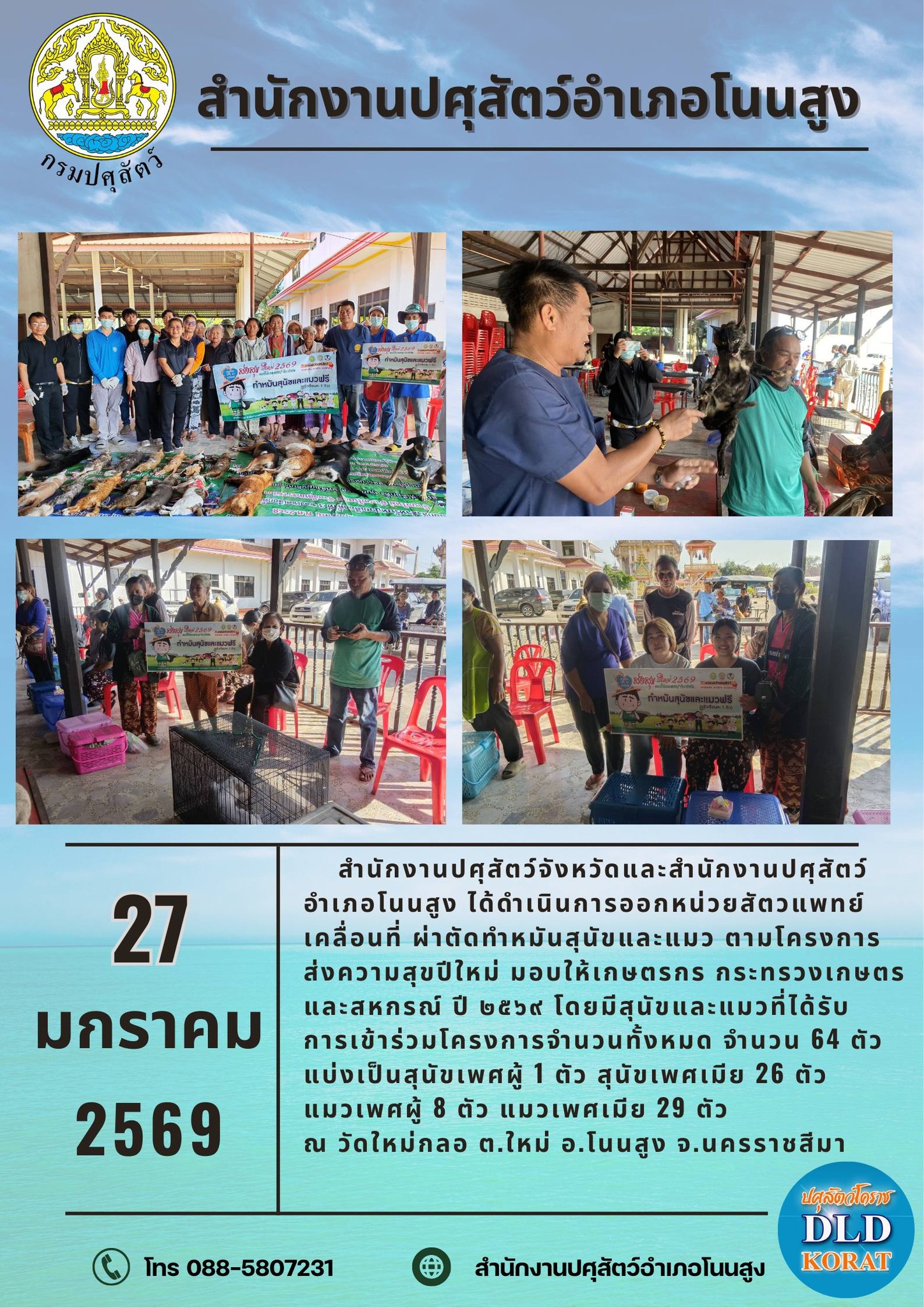 วันที่ 27 มกราคม 2569 สำนักงานปศุสัตว์จังหวัดนครราชสีมา,สำนักงานปศุสัตว์อำเภอโนนสูง ร่วมกับ เทศบาลตำบลใหม่ ส่งสุขปีใหม่ 2569 ออกหน่วยสัตวแพทย์เคลื่อนที่ ผ่าตัดทำหมันสุนัขและแมว จำนวน 64 ตัว แบ่งเป็นสุนัขเพศเมีย 25 ตัว สุนัขเพศผู้ 1 ตัว แมวเพศเมีย 29 ตัว แมวเพศผู้ 8 ตัว ทำการฉีดวัคซีนป้องกันโรคพิษสุนัขบ้าจำนวน 64 ตัว ลดค่าใช้จ่ายให้กับประชาชนตำบลใหม่ อำเภอโนนสูง จำนวน 35 ครัวเรือน มูลค่า 87,000 บาท ณ วัดใหม่กลอ ตำบลใหม่ อำเภอโนนสูง