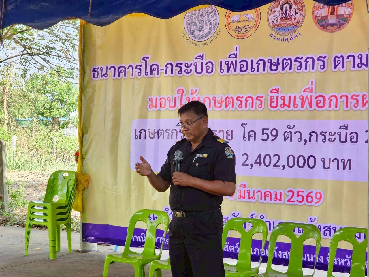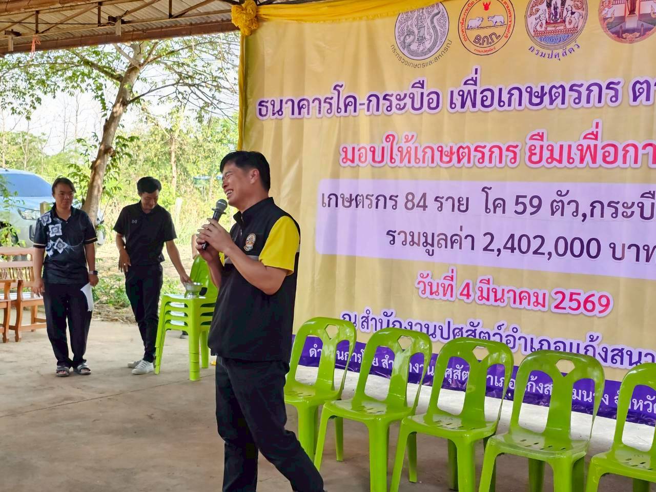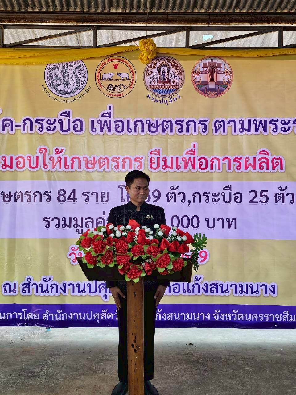 4 มี.ค.69 นายณเดชน์ จินดาพรหม นายอำเภอแก้งสนามนาง เป็นประธานในพิธีมอบโค-กระบือ จำนวน 84 ตัว ซึ่งได้รับสนับสนุนจากกรมปศุสัตว์ และจากการส่งคืนลูกตัวที่ 1ในพื้นที่ ให้แก่เกษตรกร จำนวน 84 ราย ยืมเพื่อการผลิตตามโครงการธนาคารโค-กระบือ เพื่อเกษตรกร ตามพระราชดำริ โดยมีนายเอกราช คลังอาวุธ ปศุสัตว์อำเภอแก้งสนามนาง เป็นผู้กล่าวรายงาน พร้อมด้วยหัวหน้าส่วนราชการ ผู้นำท้องที่/ท้องถิ่น ร่วมในพิธี ณ สำนักงานปศุสัตว์อำเภอแก้งสนามนาง จังหวัดนครราชสีมา #ครอบครัวปศุสัตว์ ทำด้วยใจ ทำให้ไว ทำได้จริง