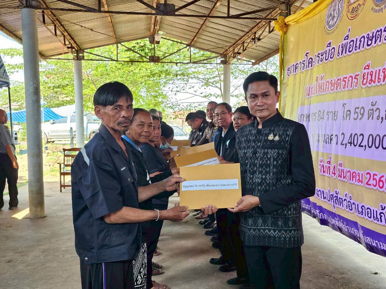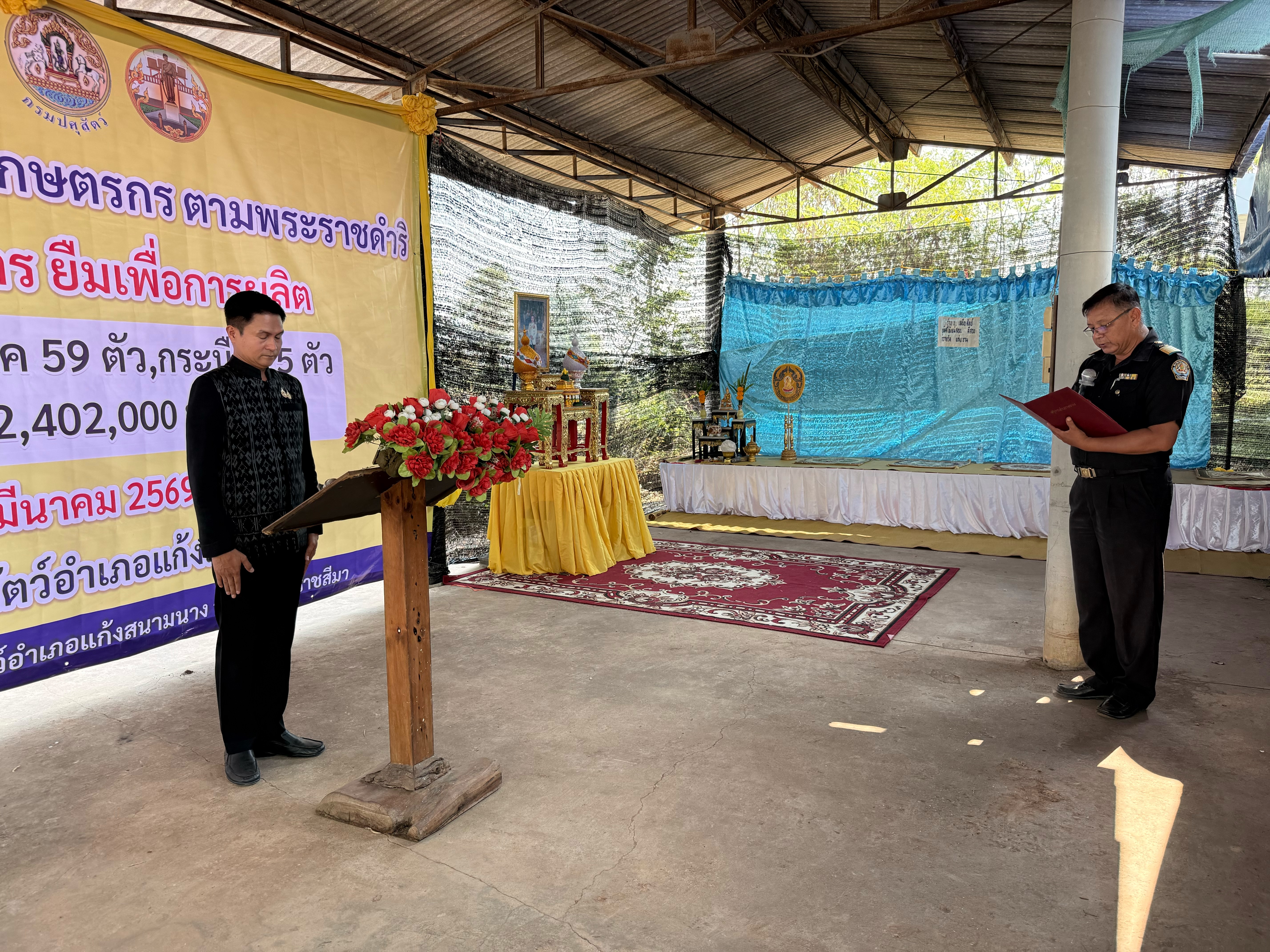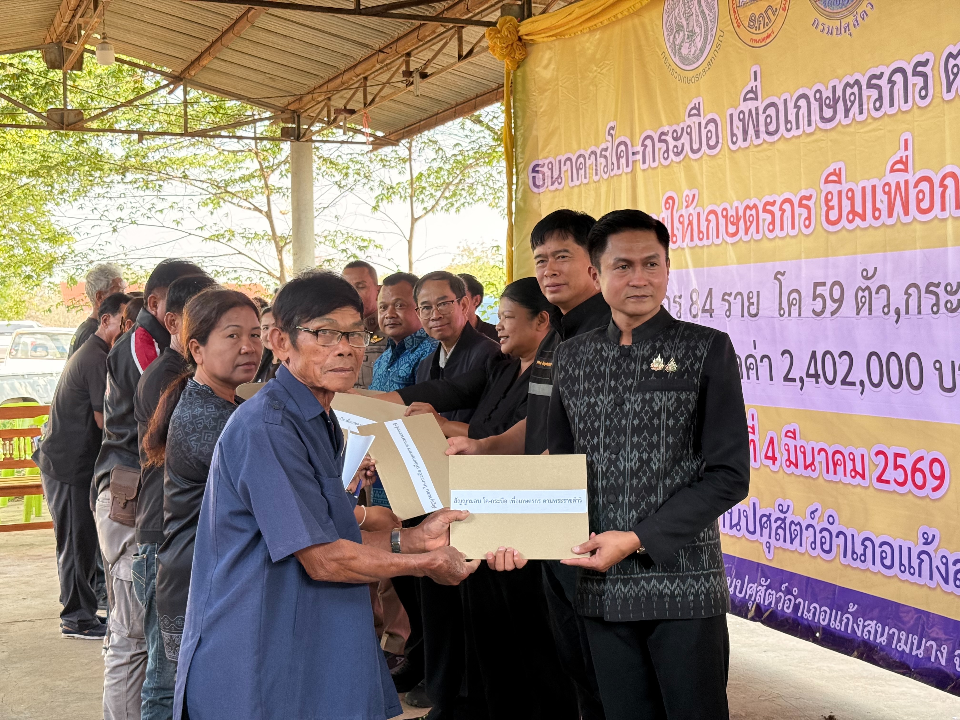 4 มี.ค.69 นายณเดชน์ จินดาพรหม นายอำเภอแก้งสนามนาง เป็นประธานในพิธีมอบโค-กระบือ จำนวน 84 ตัว ซึ่งได้รับสนับสนุนจากกรมปศุสัตว์ และจากการส่งคืนลูกตัวที่ 1ในพื้นที่ ให้แก่เกษตรกร จำนวน 84 ราย ยืมเพื่อการผลิตตามโครงการธนาคารโค-กระบือ เพื่อเกษตรกร ตามพระราชดำริ โดยมีนายเอกราช คลังอาวุธ ปศุสัตว์อำเภอแก้งสนามนาง เป็นผู้กล่าวรายงาน พร้อมด้วยหัวหน้าส่วนราชการ ผู้นำท้องที่/ท้องถิ่น ร่วมในพิธี ณ สำนักงานปศุสัตว์อำเภอแก้งสนามนาง จังหวัดนครราชสีมา #ครอบครัวปศุสัตว์ ทำด้วยใจ ทำให้ไว ทำได้จริง