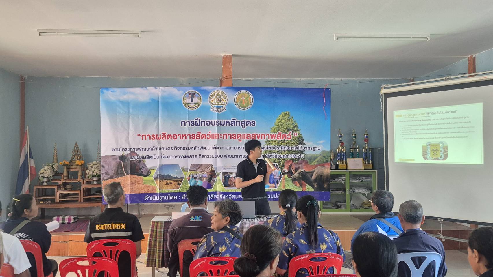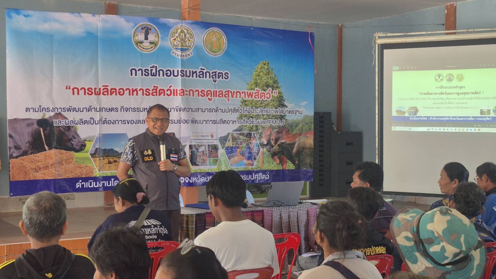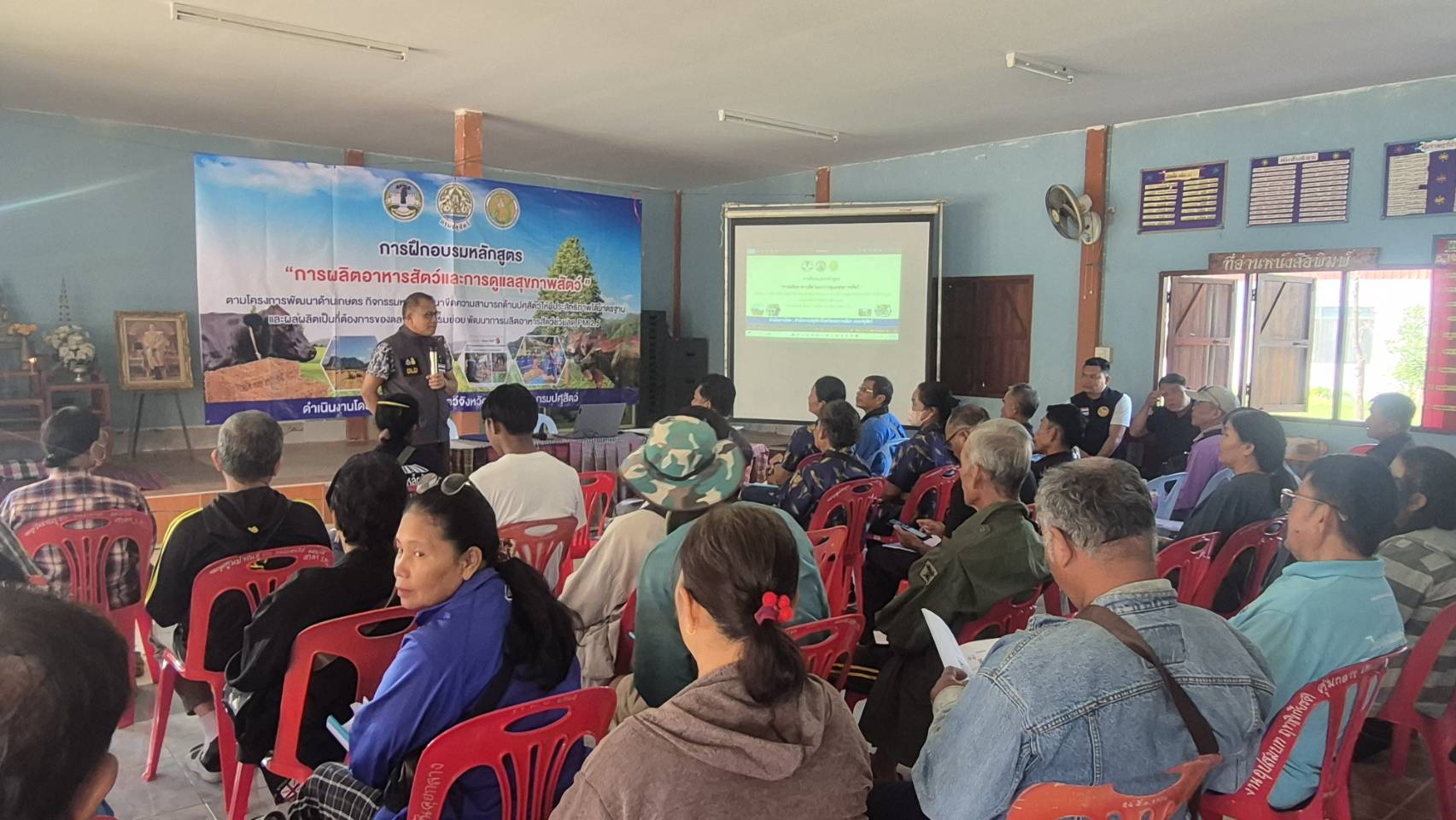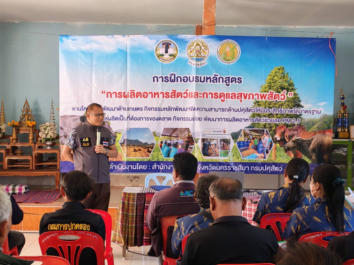 นายพศวีร์ สมใจ ปศุสัตว์จังหวัดนครราชสีมา เป็นประธานในพิธีเปิดการฝึกอบรมหลักสูตร “การผลิตอาหารสัตว์และการดูแลสุขภาพสัตว์”ให้กับเกษตรกรในพื้นที่อำเภอโนนสูง จำนวน 50 ราย เพื่อส่งเสริมให้เกษตรกรรวมกลุ่มผลิตอาหารสัตว์ที่มีคุณภาพสำรองไว้ใช้ยามขาดแคลน เพิ่มผลผลิตปศุสัตว์และลดต้นทุนด้านอาหารสัตว์ เพิ่มรายได้ให้เกษตรกร ส่งเสริมการใช้วัสดุเหลือใช้ทางการเกษตรมาเป็นอาหารสัตว์ ลดการเผา ลดฝุ่น PM 2.5 และให้ความรู้เกษตรกรในการจัดการด้านอาหารสัตว์ และการดูแลสุขภาพสัตว์ โดยมีนายก อบต. กำนัน ผู้ใหญ่บ้าน ปศุสัตว์อำเภอ หัวหน้ากลุ่มยุทธศาสตร์ฯคณะวิทยากร ร่วมในพิธี ณ ศาลาประชาคมบ้านหนองตะไก้ ต.มะค่า อ.โนนสูง จ.นครราชสีมา #งบจังหวัด69