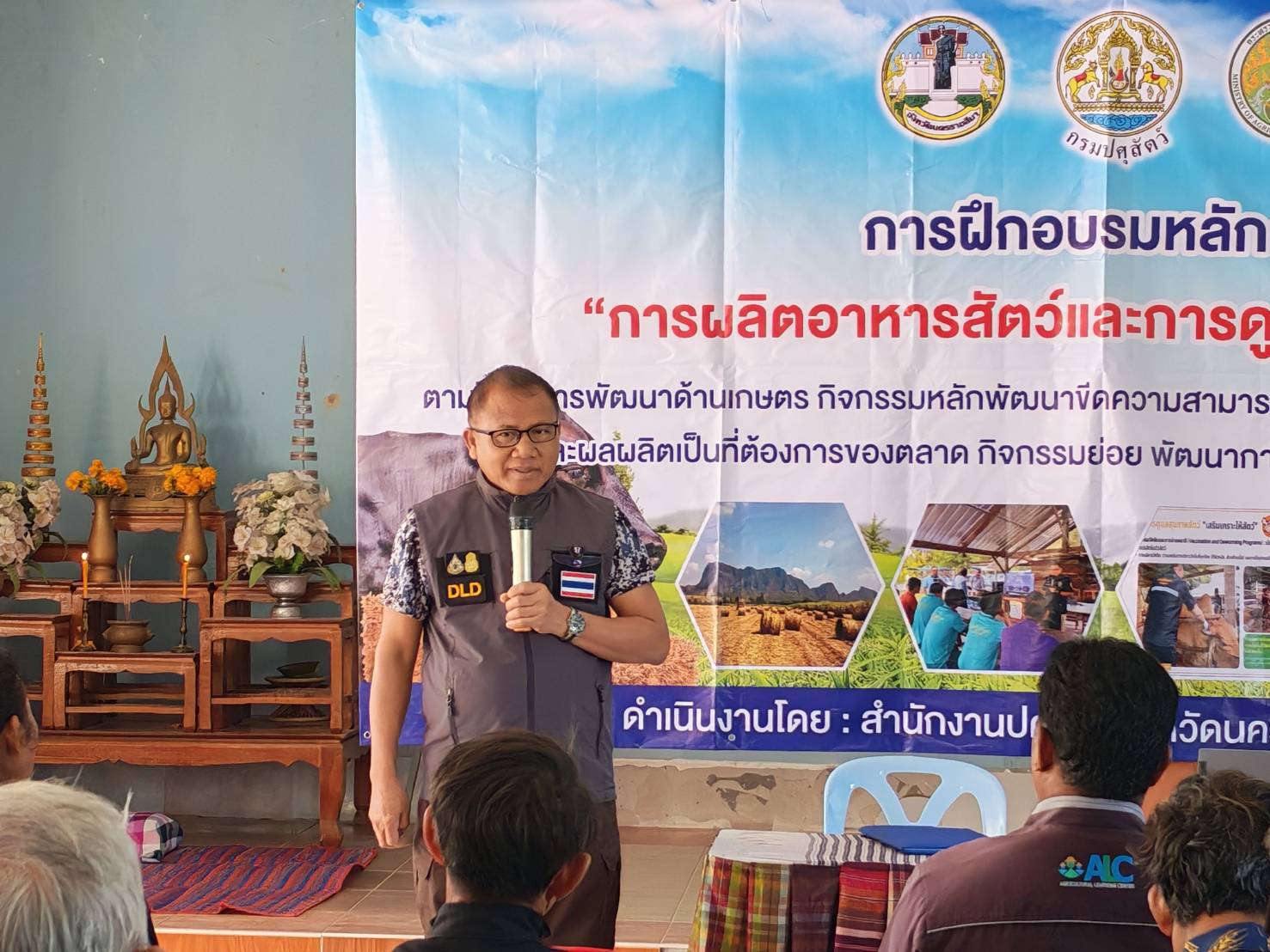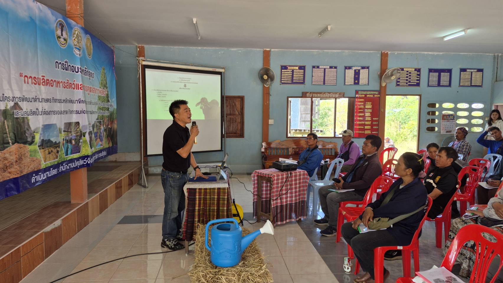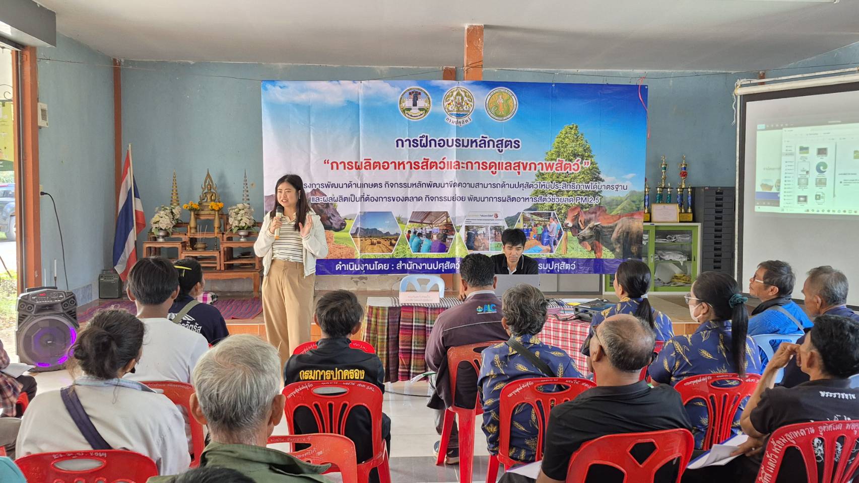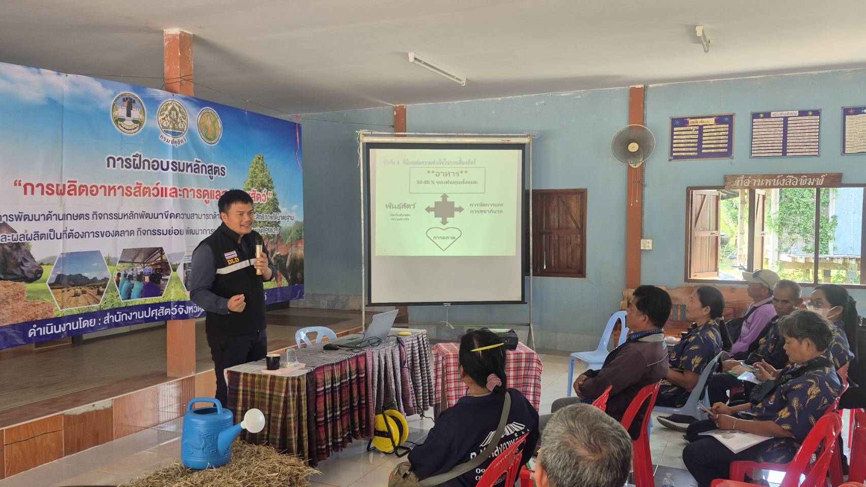 นายพศวีร์ สมใจ ปศุสัตว์จังหวัดนครราชสีมา เป็นประธานในพิธีเปิดการฝึกอบรมหลักสูตร “การผลิตอาหารสัตว์และการดูแลสุขภาพสัตว์”ให้กับเกษตรกรในพื้นที่อำเภอโนนสูง จำนวน 50 ราย เพื่อส่งเสริมให้เกษตรกรรวมกลุ่มผลิตอาหารสัตว์ที่มีคุณภาพสำรองไว้ใช้ยามขาดแคลน เพิ่มผลผลิตปศุสัตว์และลดต้นทุนด้านอาหารสัตว์ เพิ่มรายได้ให้เกษตรกร ส่งเสริมการใช้วัสดุเหลือใช้ทางการเกษตรมาเป็นอาหารสัตว์ ลดการเผา ลดฝุ่น PM 2.5 และให้ความรู้เกษตรกรในการจัดการด้านอาหารสัตว์ และการดูแลสุขภาพสัตว์ โดยมีนายก อบต. กำนัน ผู้ใหญ่บ้าน ปศุสัตว์อำเภอ หัวหน้ากลุ่มยุทธศาสตร์ฯคณะวิทยากร ร่วมในพิธี ณ ศาลาประชาคมบ้านหนองตะไก้ ต.มะค่า อ.โนนสูง จ.นครราชสีมา #งบจังหวัด69