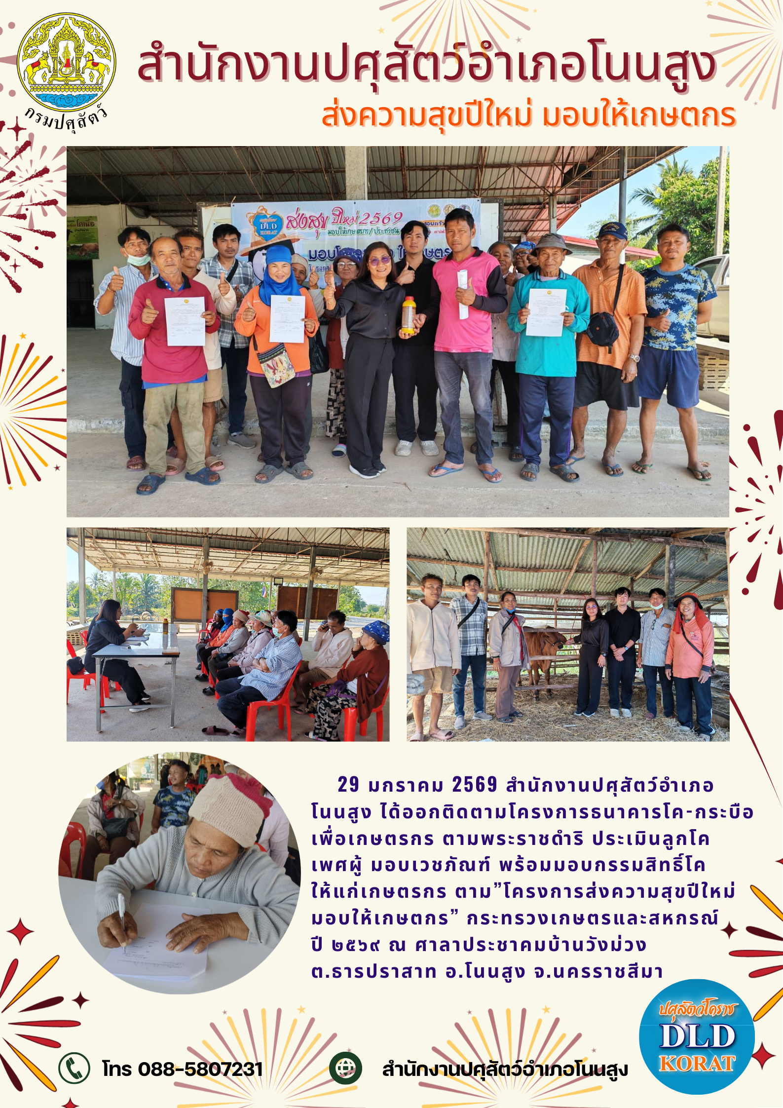 29 มกราคม 2569 สำนักงานปศุสัตว์อำเภอโนนสูง ออกติดตามงานโครงการธนาคารโค-กระบือเพื่อเกษตรกร ตามพระราชดำริ ประเมินลูกโคเพศผู้ มอบเวชภัณฑ์ พร้อมมอบกรรมสิทธิ์โคให้แก่เกษตรกร ตาม"โครงการส่งความสุขปีใหม่มอบให้เกษตรกร" กระทรวงเกษตรและสหกรณ์ปี 2569 ณ ศาลาประชาคมบ้านวังม่วงต.ธารปราสาท อ.โนนสูง จ.นครราชสีมา