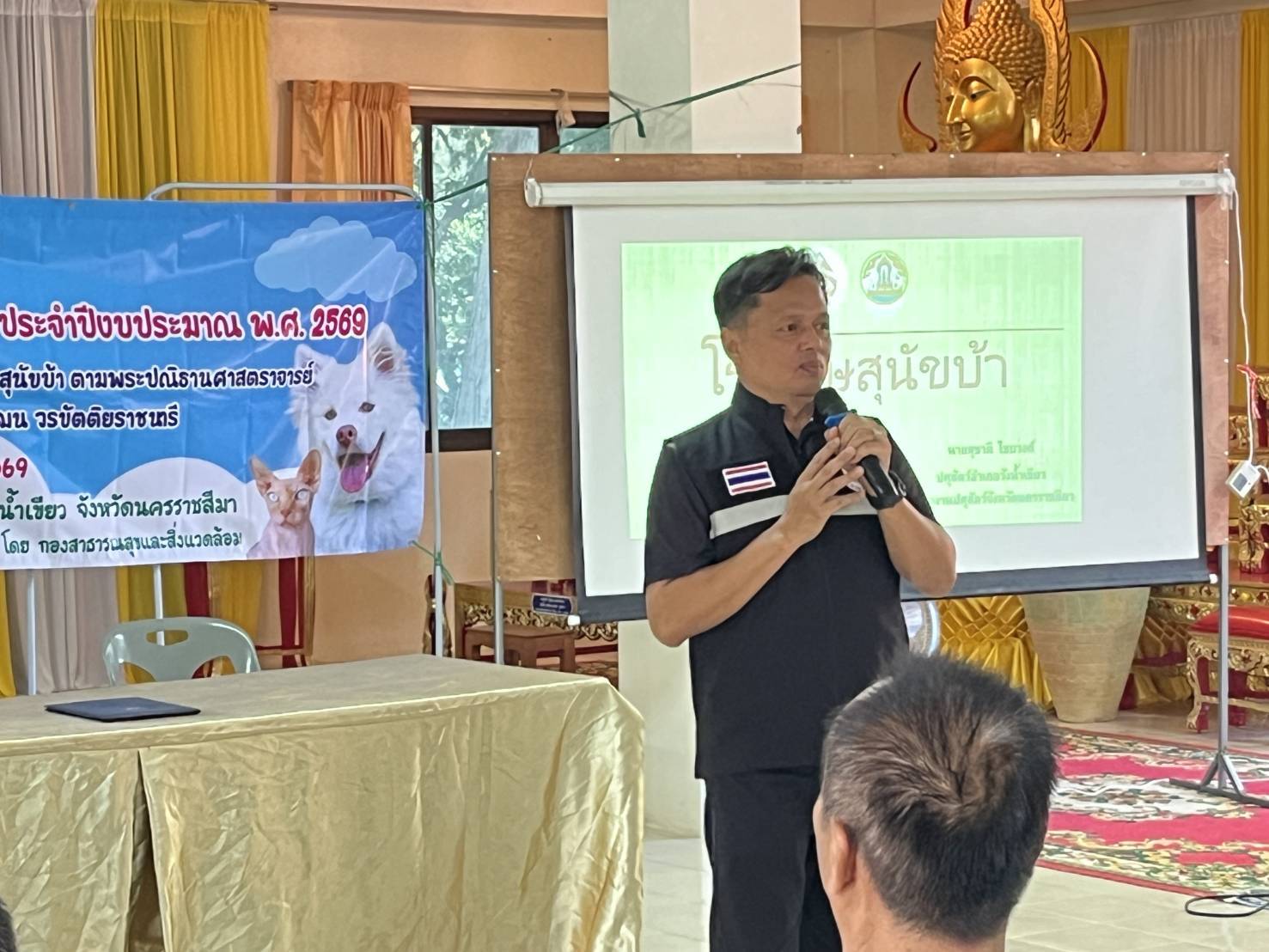 วันที่ 30 มีนาคม 2569 สำนักงานปศุสัตว์อำเภอวังน้ำเขียว โดยนายสุชาติ ไชยวงค์ ปศุสัตว์อำเภอวังน้ำเขียว พร้อมด้วยนางสาวจิตรวี สมคะเณย์ เจ้าพนักงานสัตวบาลชำนาญงาน ร่วมกิจกรรมตามโครงการความร่วมมือการรณรงค์ป้องกันโรคพิษสุนัขบ้า ประจำปีงบประมาณ พ.ศ.2569 จัดโดยองค์การบริหารส่วนตำบลอุดมทรัพย์ มุุ่งเน้นกิจกรรมการฉีดวัคซีนป้องกันโรคพิษสุนัขบ้าให้กับสุนัขแมว การประชาสัมพันธ์ให้ความรู้และการส่งเสริมให้ประชาชนเลี้ยงสุนัขและแมวอย่างถูกวิธีเพื่อลดความเสี่ยงของการเกิดโรคพิษสุนัขบ้าทั้งในคนและสัตว์ โดยมีนายเทอดไท แสงผล นายอำเภอวังน้ำเขียวเป็นประธาน ณ วัดศิริมังคลาราม ตำบลอุดมทรัพย์ อำเภอวังน้ำเขียว จังหวัดนครราชสีมา