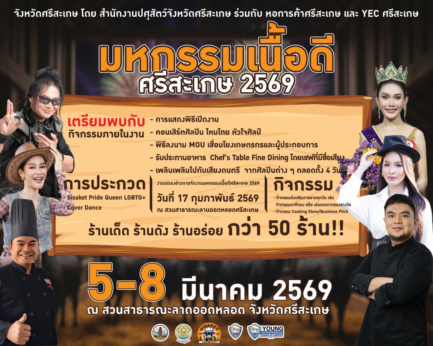 เมื่อวันที่ 17 กุมภาพันธ์ 2569 สำนักงานปศุสัตว์จังหวัดศรีสะเกษ ร่วมกับ สำนักงานจังหวัดศรีสะเกษ และหอการค้าจังหวัดศรีสะเกษ และ YEC ศรีสะเกษ แถลงข่าวงานเทศกาลเนื้อดีศรีสะเกษ ณ ลานออดหลอด โดยจัดงานเทศกาลเนื้อดีศรีสะเกษ ในระหว่างวันที่ 5-8 มีนาคม 2569 ณ ลานออดหลอด จังหวัดศรีสะเกษ