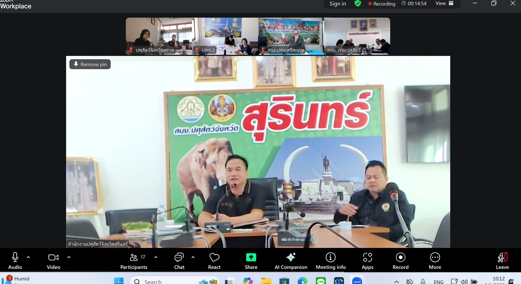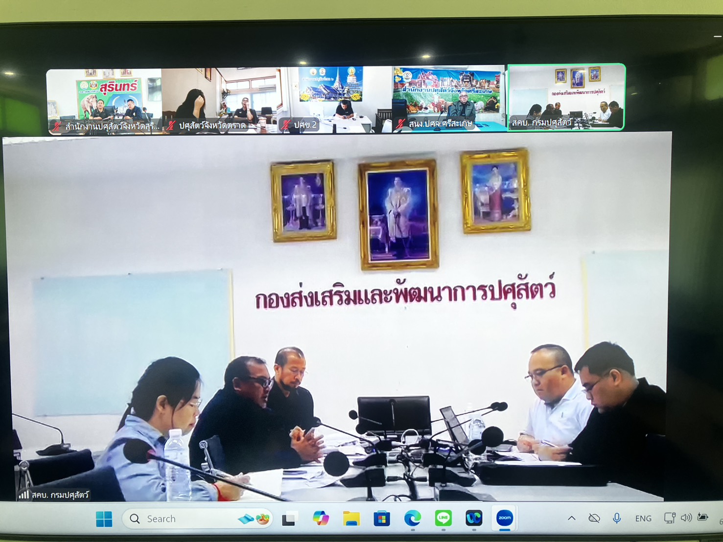 วันที่ 6 มกราคม พ.ศ. 2569 เวลา 09.30 น. นายสัตวแพทย์อภิชัย นาคีสังข์ ปศุสัตว์จังหวัดสุรินทร์ พร้อมด้วยนายศรัณวัชร์ บุญเกิด หัวหน้ากลุ่มยุทธศาสตร์และสารสนเทศการปศุสัตว์ และเจ้าหน้าที่ที่เกี่ยวข้อง ร่วมประชุมเพื่อรับฟังการชี้แจงหลักเกณฑ์การฟื้นฟู เยียวยาสัตว์ที่ได้รับผลกระทบเหตุการณ์การปะทะแนวชายแดนไทย-กัมพูชา จากกองกำลังภายนอกประเทศ โดยกองส่งเสริมและพัฒนาการปศุสัตว์ ผ่านระบบ Zoom Meeting ณ ห้องประชุมสำนักงานปศุสัตว์จังหวัดสุรินทร์