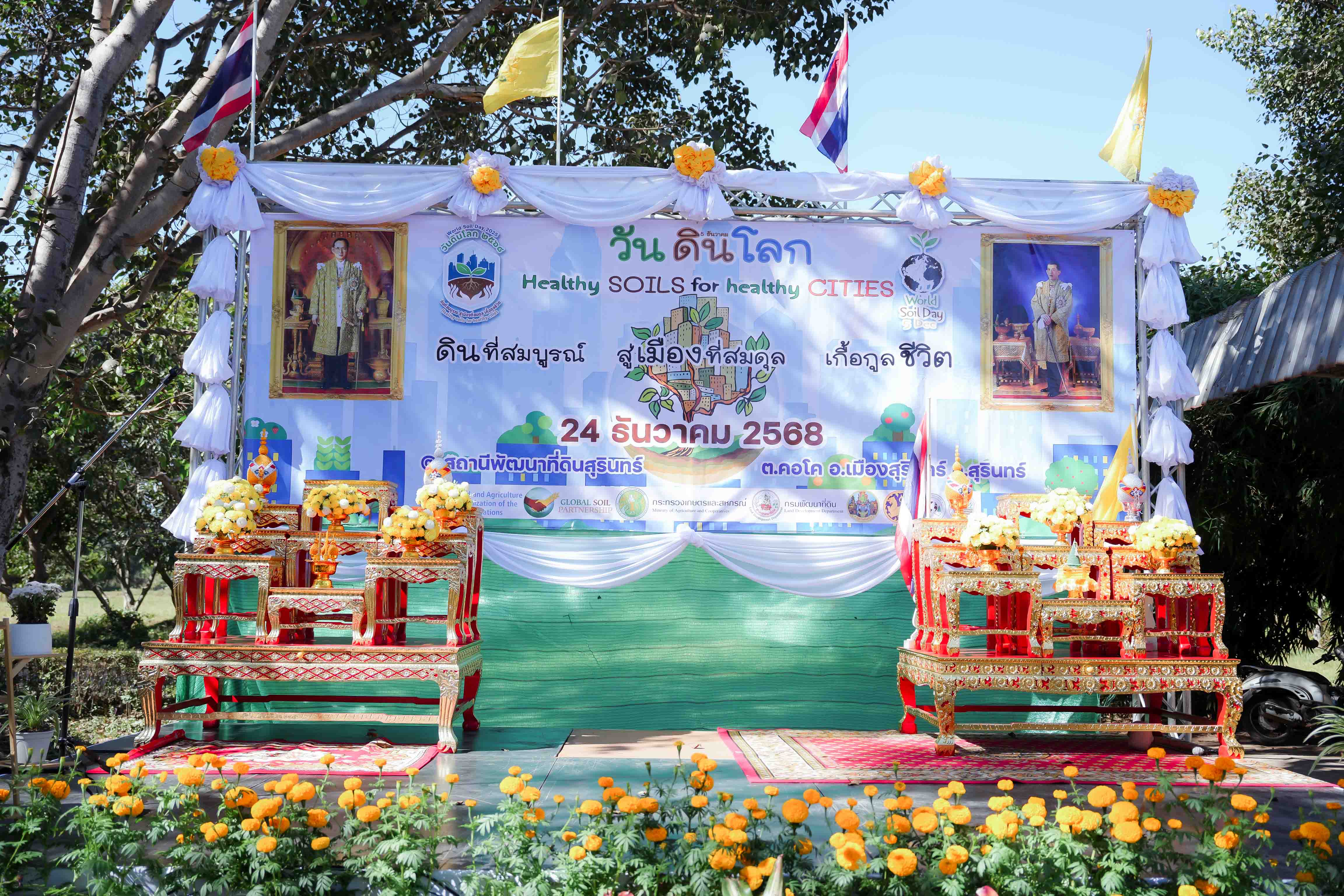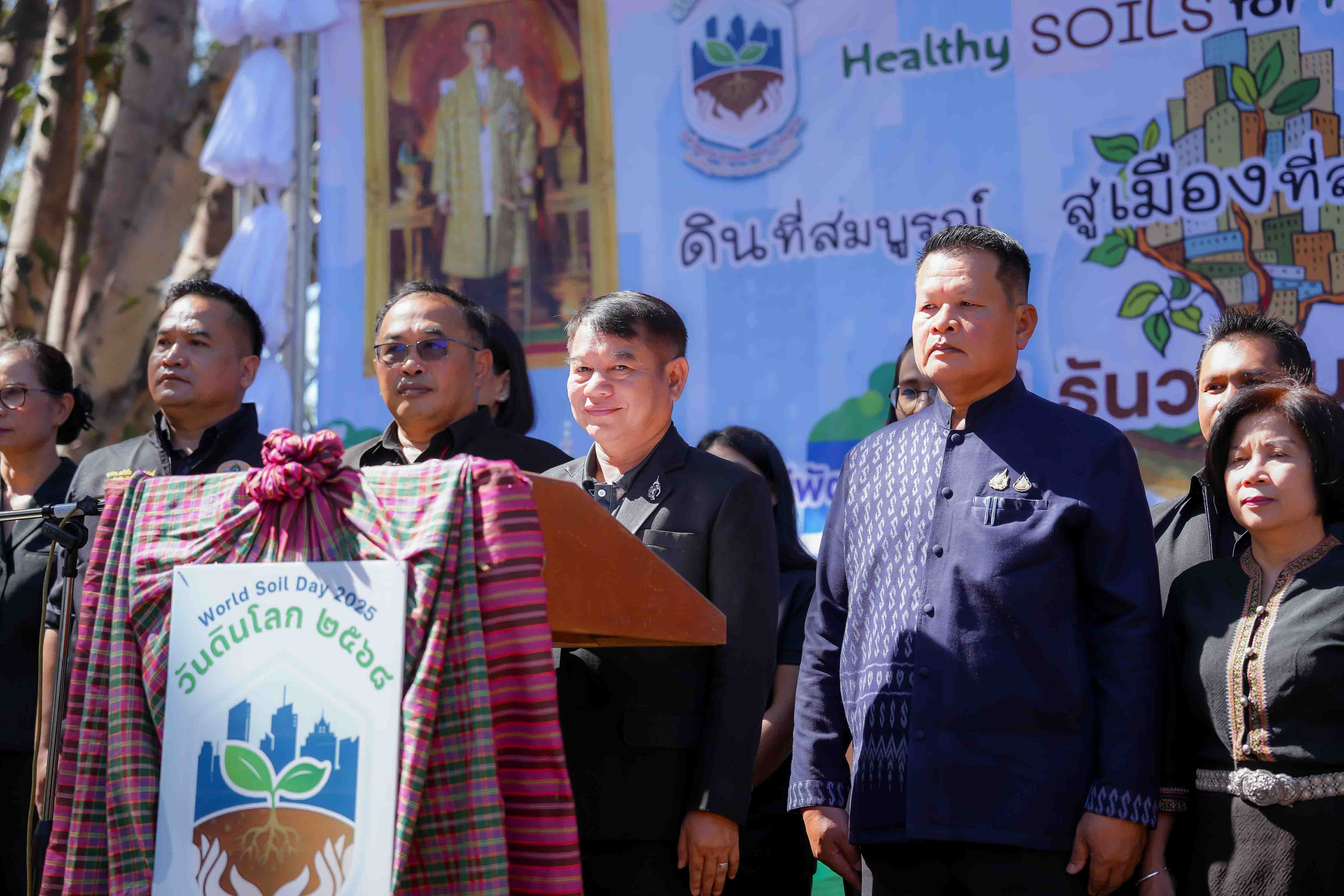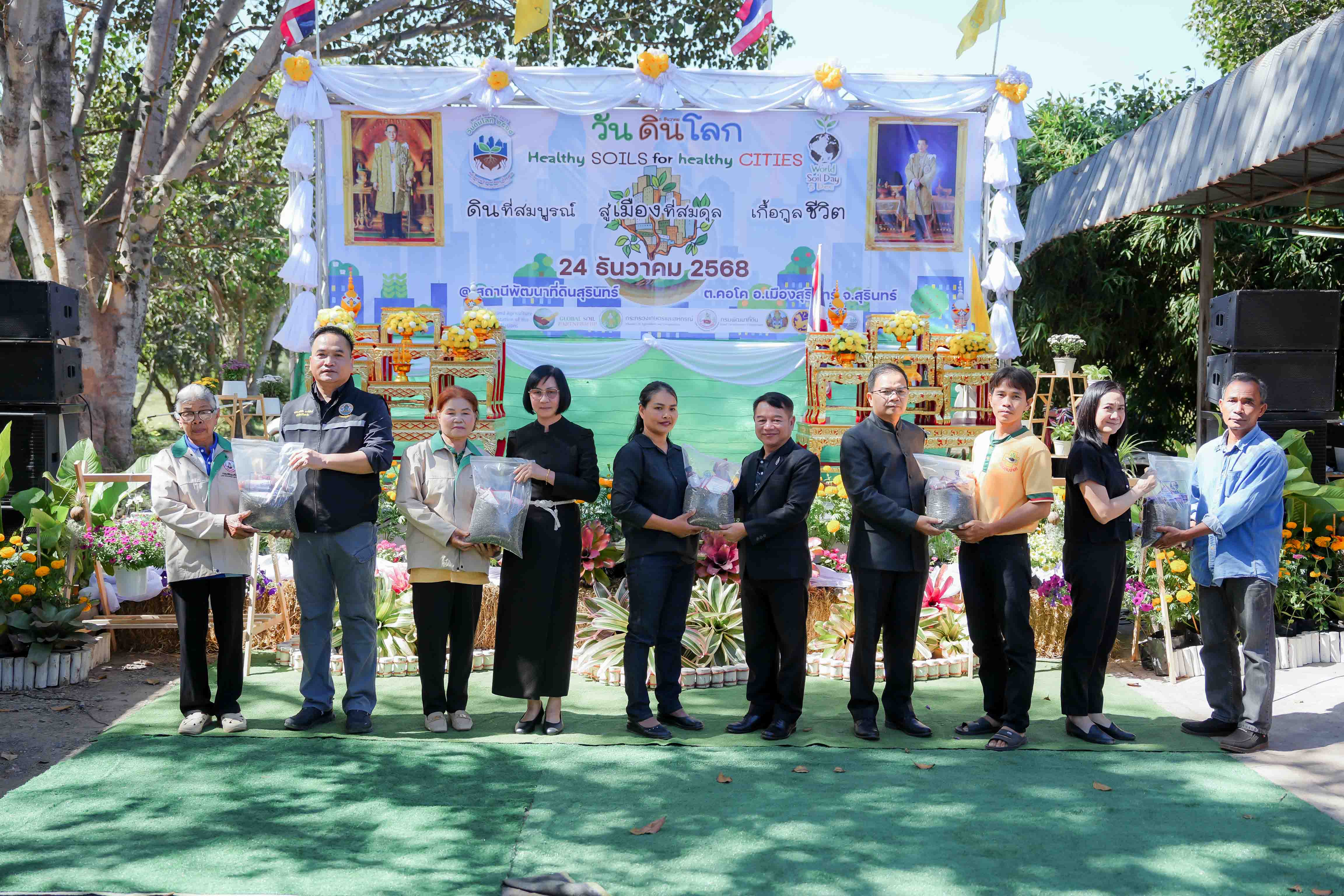 วันที่ 24 ธันวาคม 2568 นายสัตวแพทย์อภิชัย นาคีสังข์ ปศุสัตว์จังหวัดสุรินทร์ พร้อมด้วย นายสุพิน นองมัน หัวหน้ากลุ่มส่งเสริมและพัฒนาการปศุสัตว์ และเจ้าหน้าที่กลุ่มส่งเสริมและพัฒนาการปศุสัตว์ ร่วมกิจกรรม “วันดินโลก ปี 2568 (World Soil Day) ภายใต้หัวข้อ “Healty Soils for Healty Citie ดินดีที่สมบูรณ์ สู่เมืองที่สมดุล เกื้อกูลชีวิต” เพื่อเฉลิมพระเกียรติพระบาทสมเด็จพระบรมชนกาธิเบศร มหาภูมิพลอดุลยเดชมหาราช บรมนาถบพิตร เนื่องในวันดินโลก 5 ธันวาคม 2568 (World Soil Day) ณ สถานีพัฒนาที่ดินสุรินทร์ ตำบลคอโค อำเภอเมืองสุรินทร์ จังหวัดสุรินทร์ โดยสำนักงานปศุสัตว์จังหวัดสุรินทร์ ได้จัดนิทรรศการด้านองค์ความรู้หลักการเลี้ยงสัตว์เบื้องต้น รวมถึงการให้คำแนะนำองค์ความรู้หลักการป้องกันโรคเบื้องต้น มีกิจกรรมภายในงานประกอบด้วย การกิจกรรมที่จัดในอาคาร เช่น นิทรรศการเฉลิมพระเกียรติ นักวิทยาศาสตร์ดินเพื่อมนุษยธรรม แสดงหลักการของแนวพระราชดำรินิทรรศการทางวิชาการดิน เช่น ความเป็นมาของวันดินโลก ความสำคัญของดิน และกิจกรรมกลางแจ้ง ได้แก่ การจัดแสดงฐานเรียนรู้โดยจัดรูปแบบนิทรรศการมีชีวิต ประกอบด้วย ฐานเรียนรู้ปฐพีวิทยาและเทคโนโลยีนวัตกรรม ฐานเรียนรู้เกษตรอินทรีย์ ใส่ใจมาตรฐานและตรวจวัดจัดการ และฐานเรียนรู้ระบบอนุรักษ์ดินและน้ำ เพื่อส่งเสริมความเป็นอยู่และคุณภาพชีวิตของเกษตรกรโดยรวมให้ดีขึ้น เป็นต้น