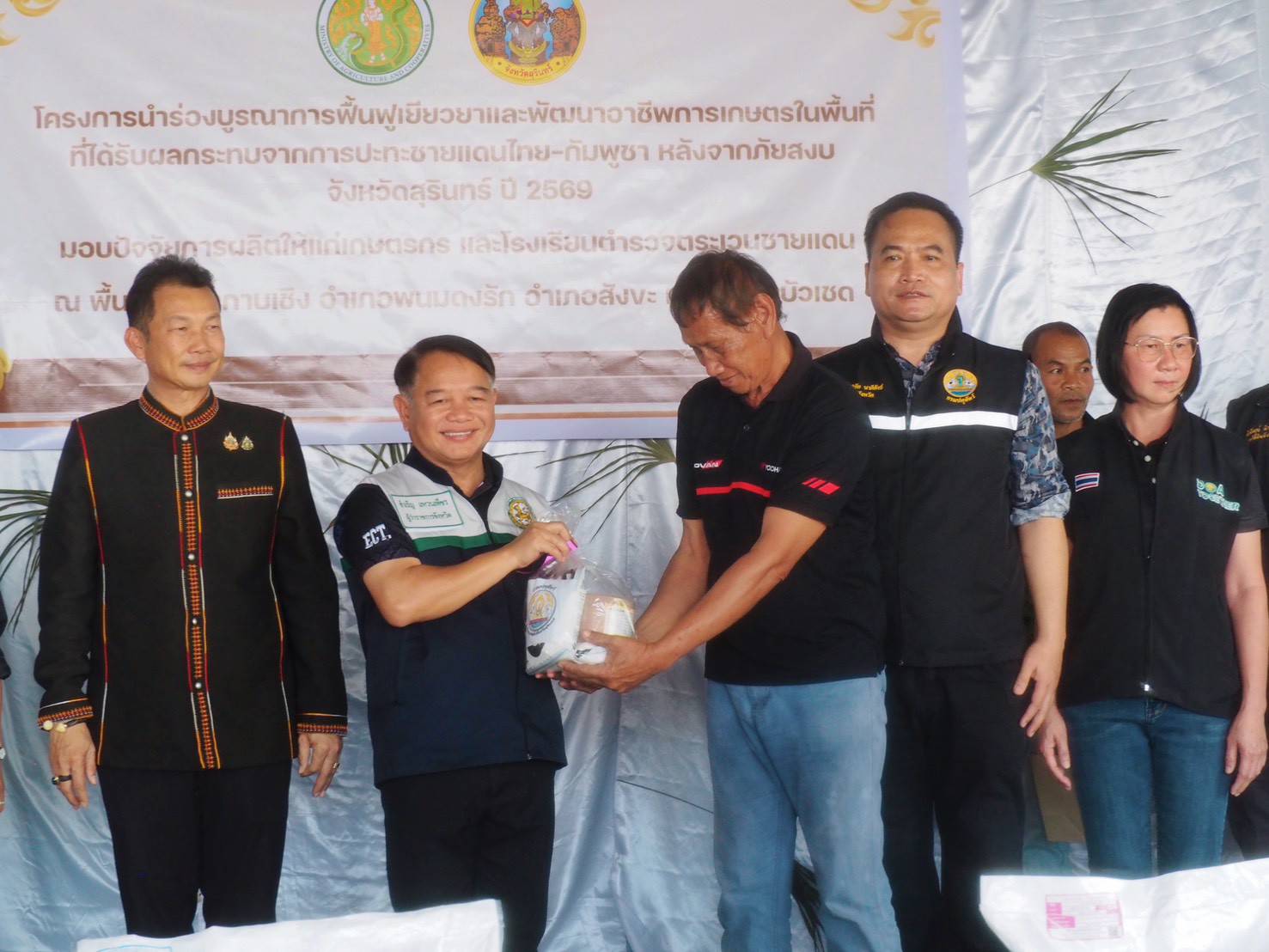ทั้งนี้ ท่านผู้ว่าราชการจังหวัดสุรินทร์ ได้กล่าวเปิดโครงการ และมอบปัจจัยการผลิตให้แก่โรงเรียนตำรวจตระเวนชายแดนและเกษตรกรในพื้นที่ 2 อำเภอดังล่าว (นำร่อง) เพื่อเป็นขวัญกำลังใจและเสริมสร้างความมั่นคงด้านอาชีพและความเป็นอยู่ของประชาชนในพื้นที่ชายแดนอย่างยั่งยืน