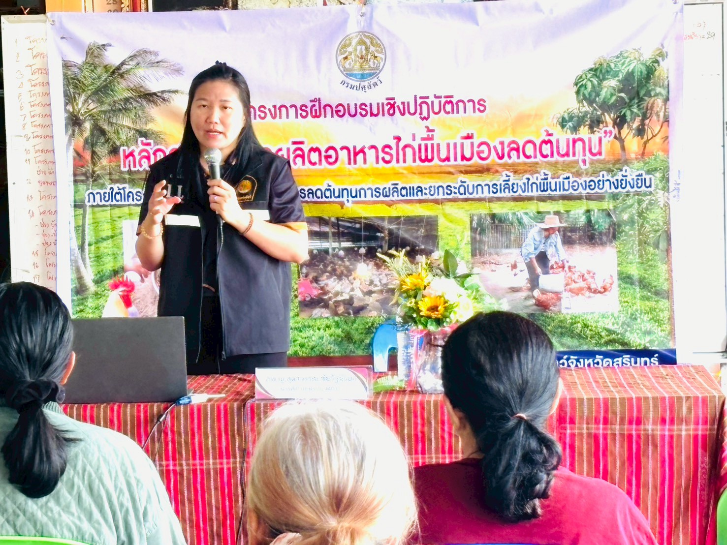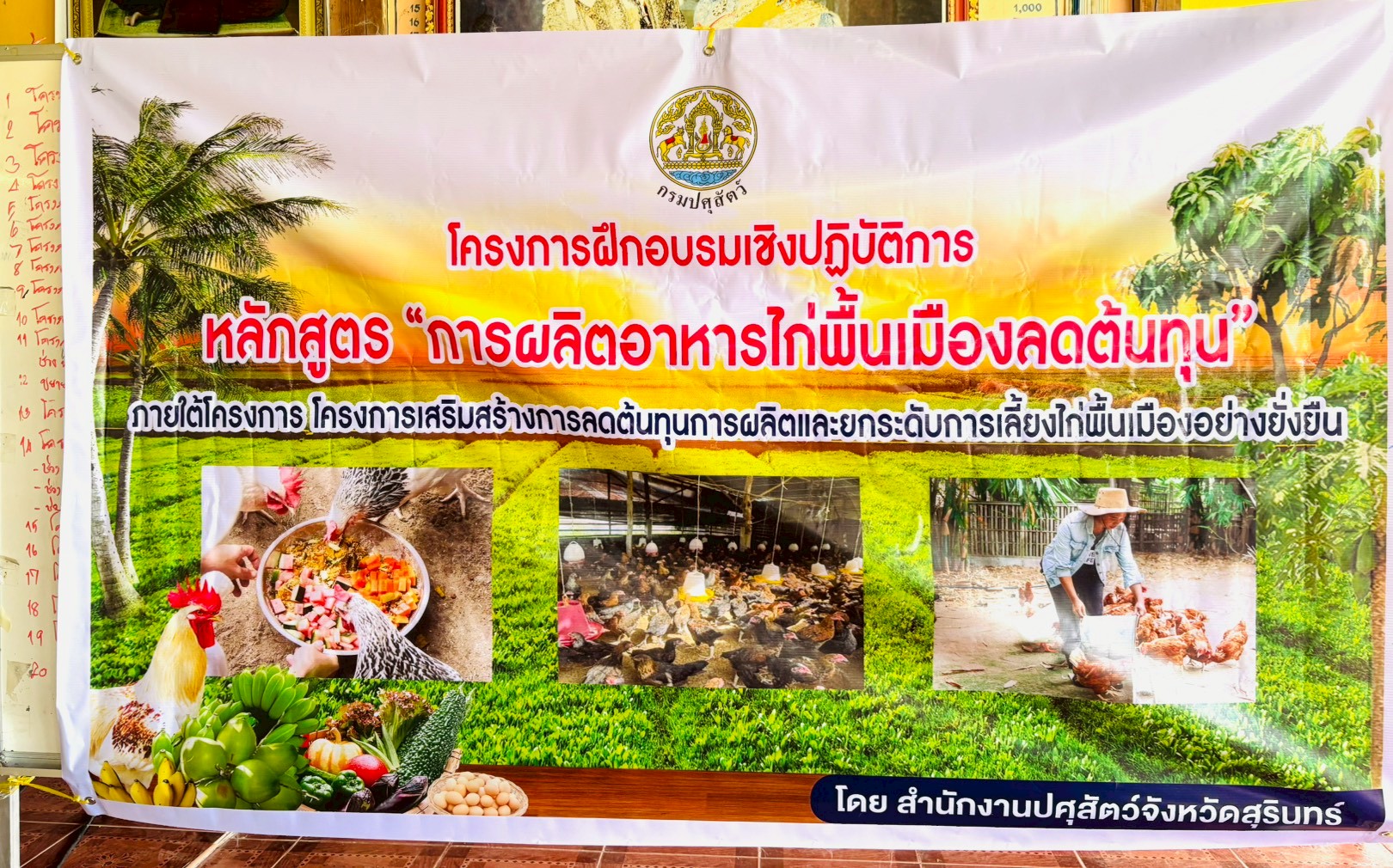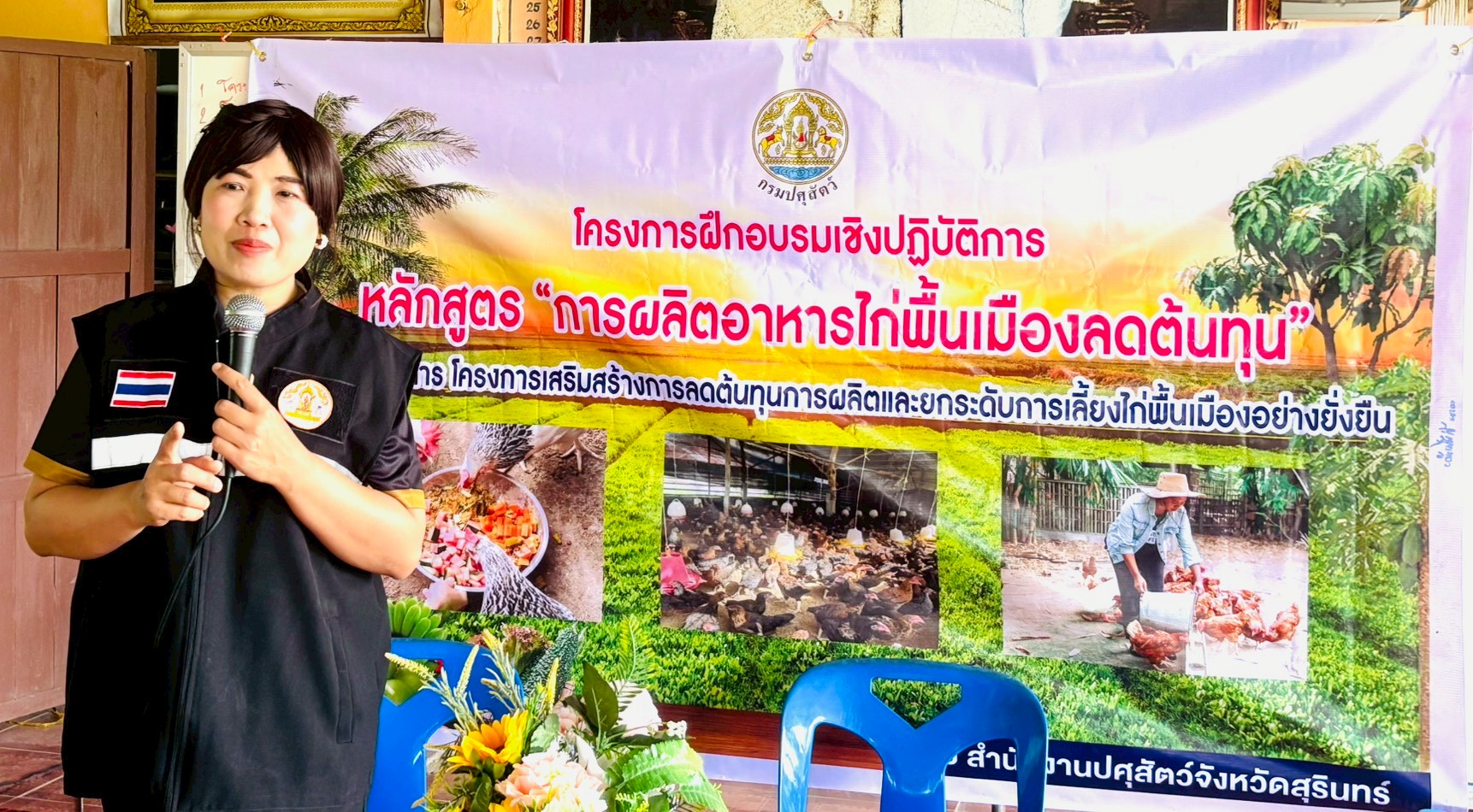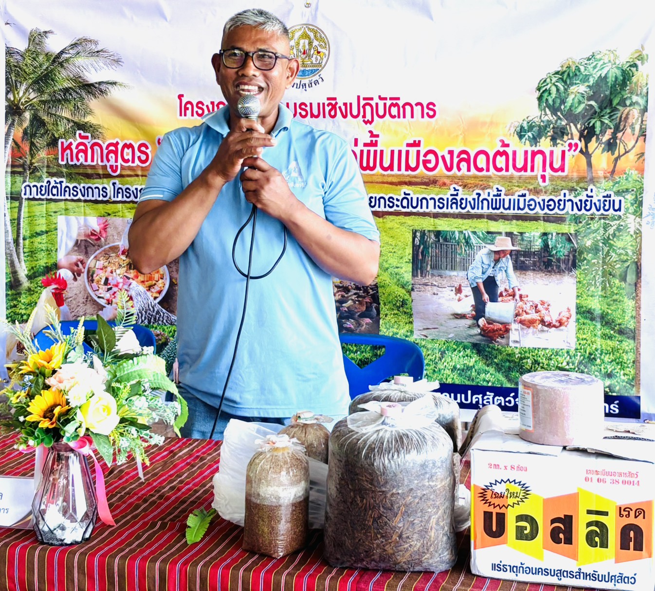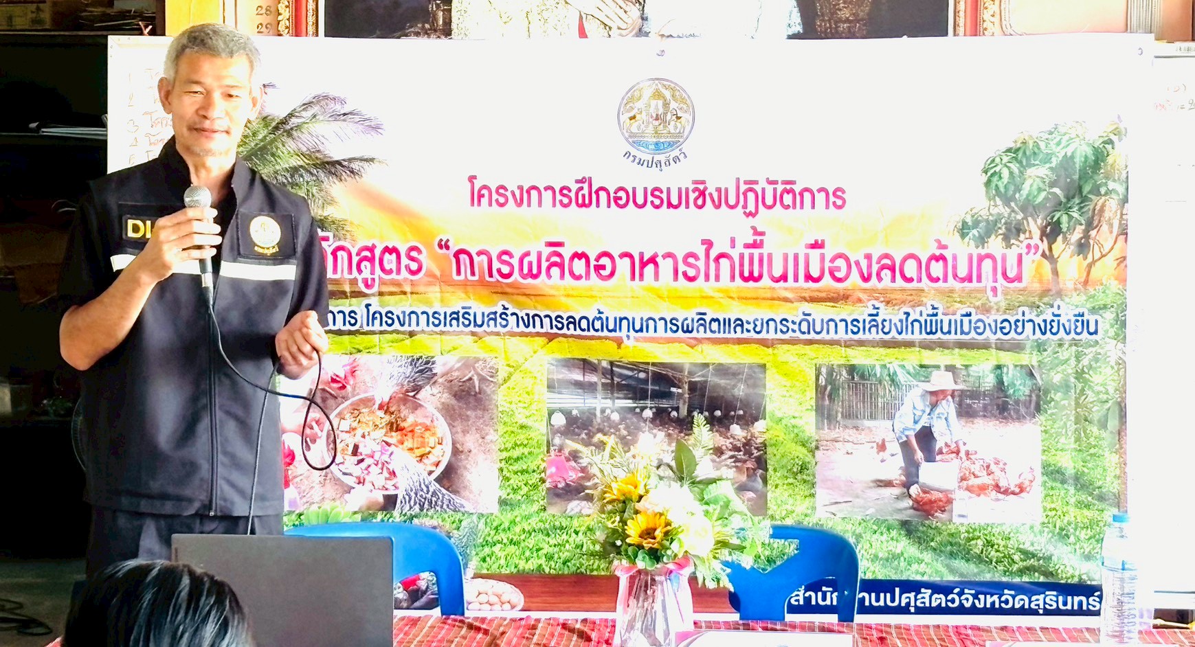 โดยมีรายละเอียด การฝึกอบรม ภาคทฤษฎีบรรยาย การผลิตอาหารไก่พื้นเมืองเพื่อลดต้นทุน การยกระดับฟาร์มไก่พื้นเมือง ตามมาตรฐาน GFM และมีภาคปฏิบัติ การสาธิตการทำสูตรอาหารไก่พื้นเมือง เพื่อลดต้นทุน