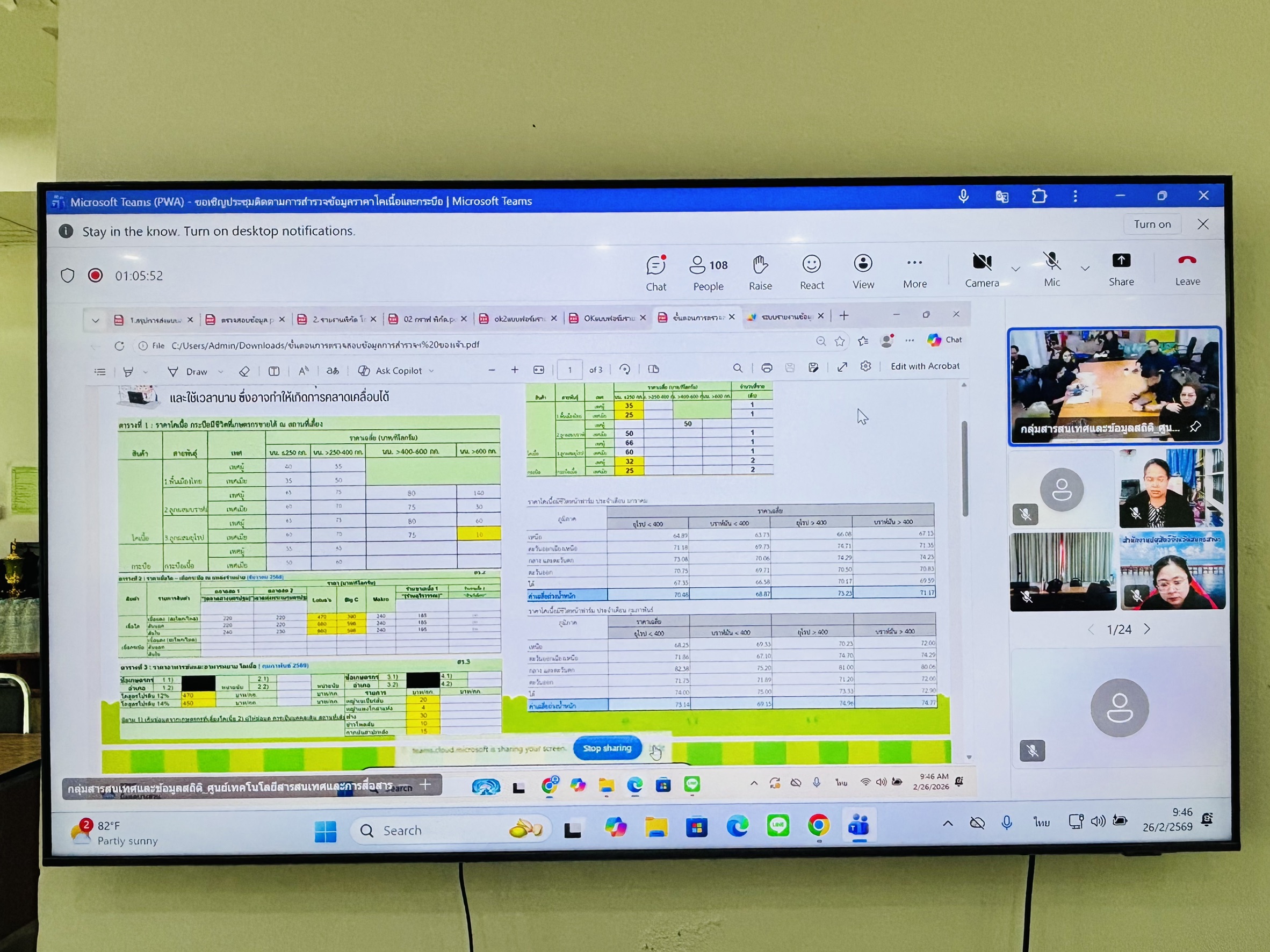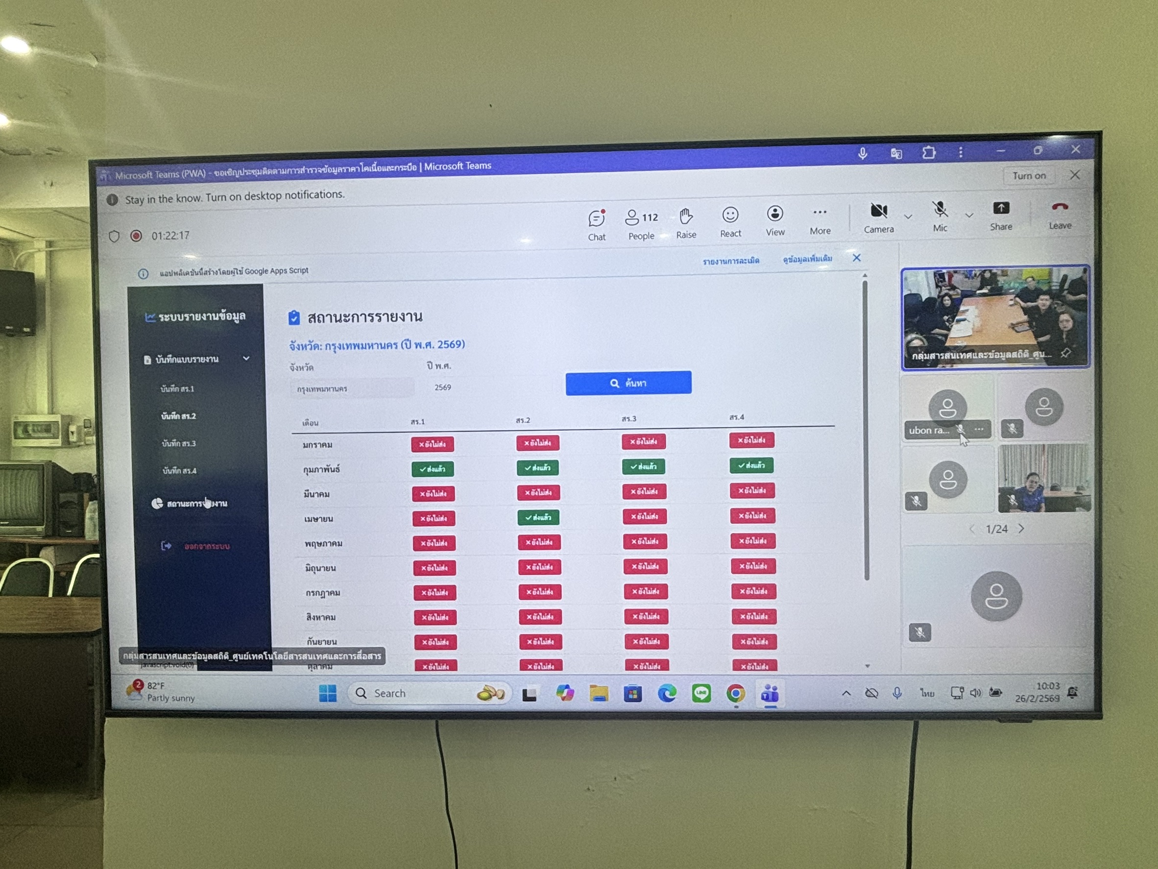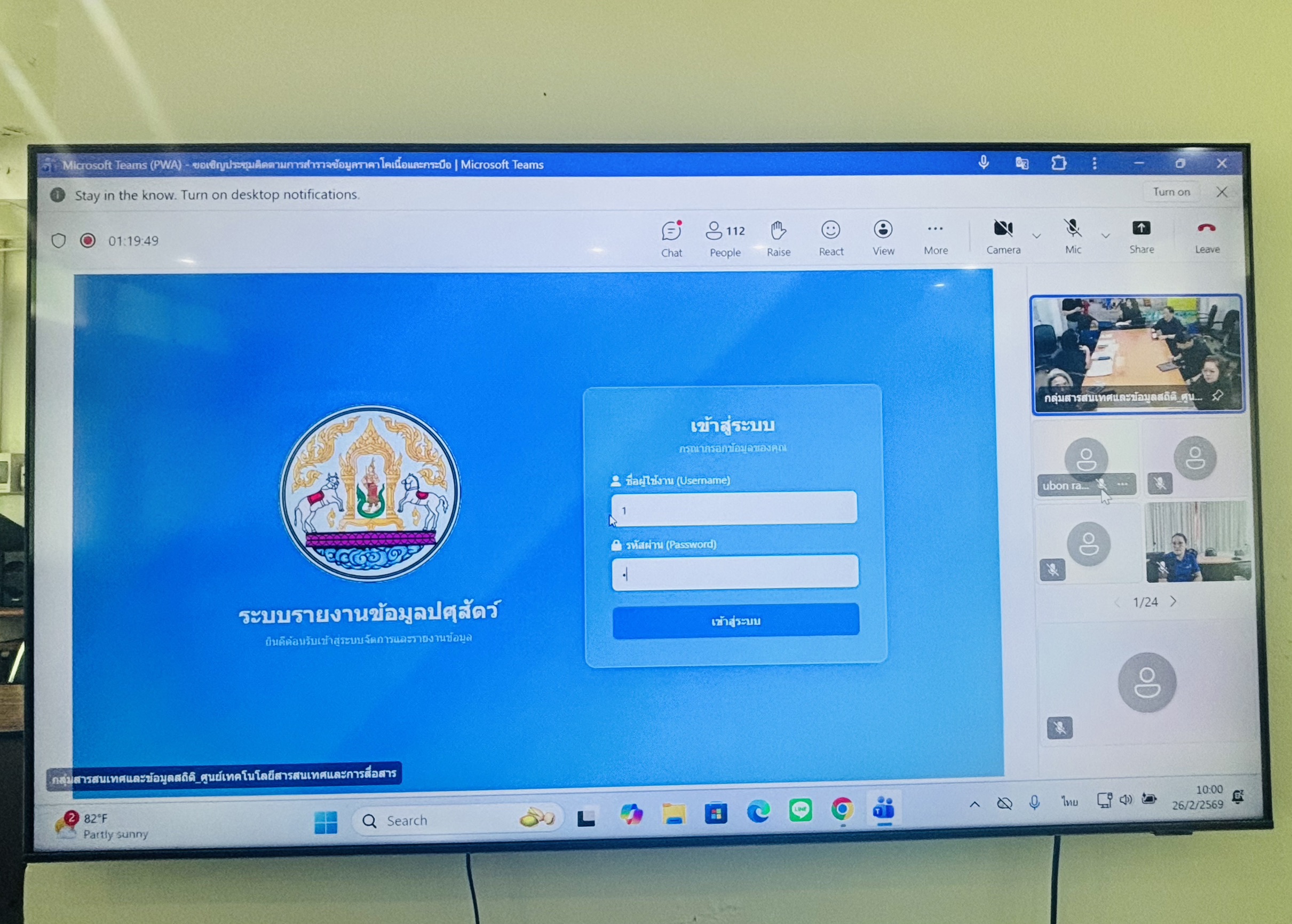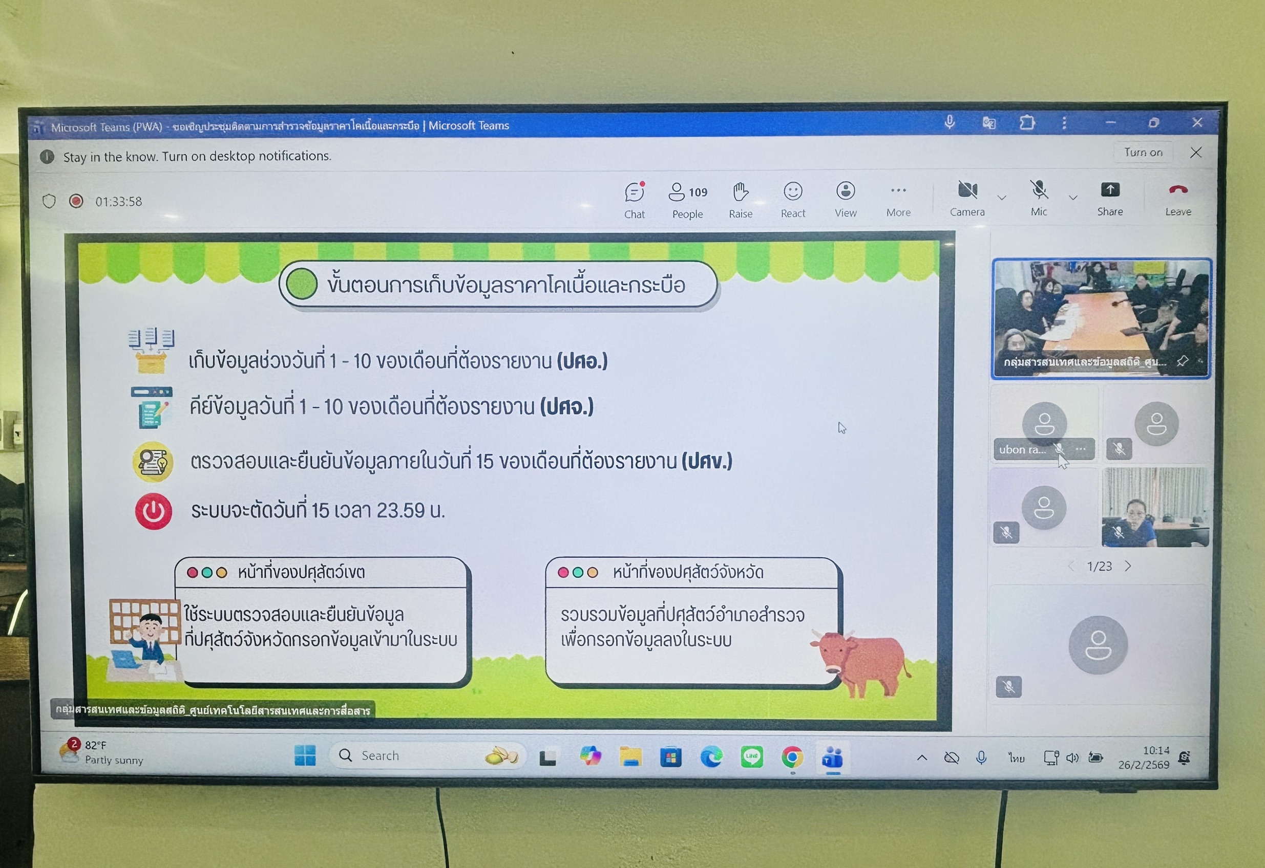 วันที่ 26 กุมภาพันธ์ 2569 เวลา 09.30 น. นายสัตวแพทย์อภิชัย นาคีสังข์ ปศุสัตว์จังหวัดสุรินทร์ มอบหมายให้นางสาวอรัญญา ไวยาประโคน เจ้าหน้าที่ระบบงานคอมพิวเตอร์ และนางสาววัชรีบุตร เสาเกลียว จ้างเหมางานด้านการเฝ้าระวัง ควบคุม และป้องกันโรคระบาดสัตว์ เข้าร่วมประชุมติดตามการสำรวจข้อมูลราคโคเนื้อและกระบือรายเดือน ของปศุสัตว์เขต และปศุสัตว์จังหวัด ผ่านระบบประชุมทางไกล Microsoft Teams จัดโดยศูนย์เทคโนโลยีสารสนเทศและสารสนเทศ กรมปศุสัตว์