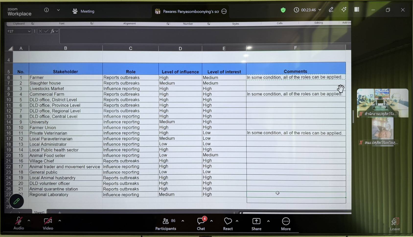 ทั้งนี้ การจัดทำข้อมูลครอบคลุมรายชื่อผู้มีส่วนได้ส่วนเสีย บทบาทหน้าที่ และระดับอิทธิพลต่อการรายงานโรค เพื่อใช้เป็นแนวทางในการพัฒนาระบบเฝ้าระวังโรคสัตว์ให้มีประสิทธิภาพ และเสริมสร้างความร่วมมือระหว่างประเทศอย่างยั่งยืน โดยข้อมูลจะถูกนำเสนอในภาพรวมระดับภูมิภาคโดยไม่เปิดเผยแหล่งที่มา