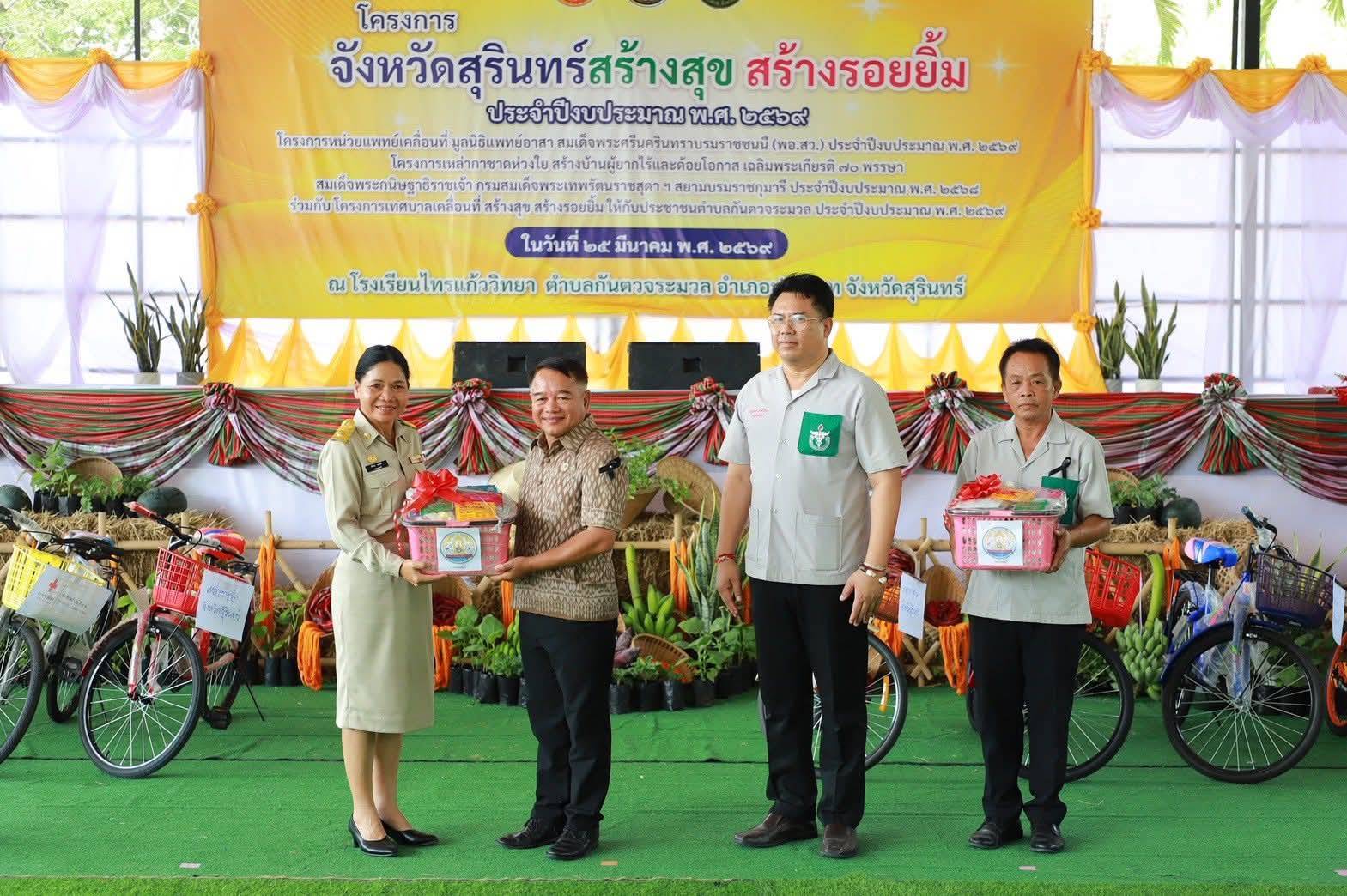 วันที่ 25 มีนาคม 2569 นายสัตวแพทย์อภิชัย นาคีสังข์ ปศุสัตว์จังหวัดสุรินทร์ มอบหมายให้นายสัตวแพทย์จรูญวิทย์ นะพรรัมย์ หัวหน้ากลุ่มพัฒนาสุขภาพสัตว์ พร้อมด้วยนายนครชัย จันทพันธ์ ปศุสัตว์อำเภอปราสาท เจ้าหน้าที่กลุ่มพัฒนาสุขภาพสัตว์ สำนักงานปศุสัตว์จังหวัดสุรินทร์ และสำนักงานปศุสัตว์อำเภอปราสาทร่วมกิจกรรมออกหน่วยโครงการจังหวัดสุรินทร์สร้างสุข สร้างรอยยิ้ม และโครงการเหล่ากาชาดห่วงใยสร้างบ้านผู้ยากไร้และด้อยโอกาสเฉลิมพระเกียรติฯ ประจำปีงบประมาณ พ.ศ.2569 ในพื้นที่อำเภอปราสาท ณ โรงเรียนบ้านไทรแก้ววิทยา ตำบลกันตวจระมวล อำเภอปราสาท จังหวัดสุรินทร์ โดยมี