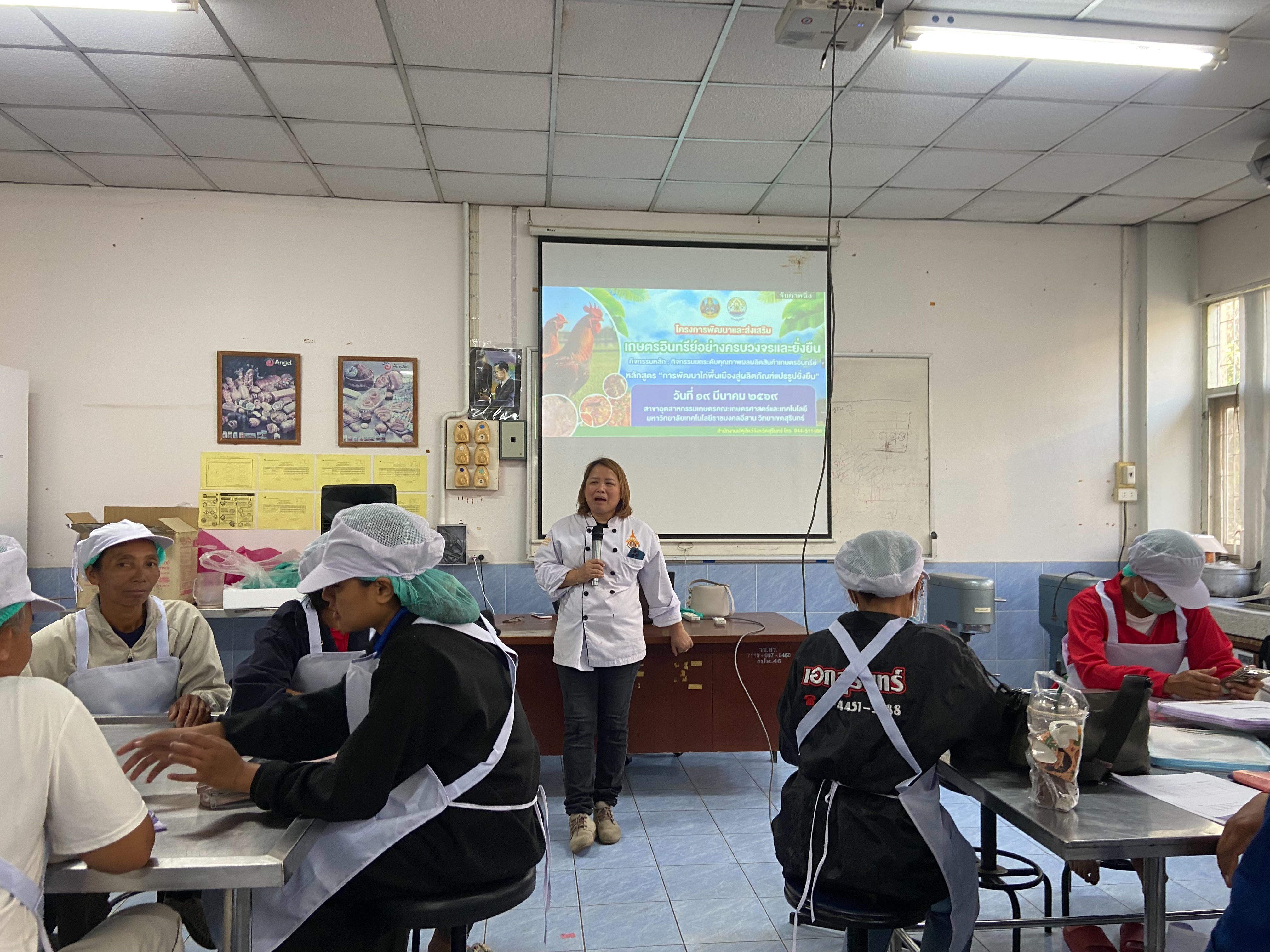 วันที่ 19 มี.ค 2569 น.สพ.อภิชัย นาคีสังข์ ปศุสัตว์จังหวัดสุรินทร์ มอบหมายให้ นายศรัณวัชร์ บุญเกิด หัวหน้ากลุ่มยุทธศาสตร์และสารสนเทศการปศุสัตว์ พร้อมด้วยเจ้าหน้าที่กลุ่มยุทธศาสตร์และสารสนเทศการปศุสัตว์ สำนักงานปศุสัตว์จังหวัดสุรินทร์ ร่วมจัดโครงการตามแผนปฏิบัติราชการประจำปีของจังหวัด ประจำปีงบประมาณ พ.ศ. 2569 โครงการพัฒนางานพื้นที่โครงการพัฒนาและส่งเสริมเกษตรอินทรีย์อย่างครบวงจรอย่างยั่งยืน กิจกรรมหลัก : กิจกรรมยกระดับคุณภาพผลผลิตสินค้าเกษตรอินทรีย์ กิจกรรมย่อย : ส่งเสริมการเลี้ยงไก่พื้นเมืองอินทรีย์ PGS Surin อย่างครบวงจร ภาคปฏิบัติ รุ่นที่ 4 เป้าหมายผู้เข้าร่วมอบรมจำนวน 60 ราย ได้แก่ เกษตรกรอำเภอศรีณรงค์และอำเภอลำดวน ณ ห้องปฏิบัติการ สาขาอุตสาหกรรมเกษตร คณะเกษตรศาสตร์และเทคโนโลยี มหาวิทยาลัยเทคโนโลยีราชมงคลอีสาน วิทยาเขตสุรินทร์ โดยโครงการดังกล่าวได้มีกิจกรรมให้ผู้เข้าร่วมได้ปฏิบัติการแปรรูปอาหารจากไก่พื้นเมืองทั้งสิ้น 2 เมนู ได้แก่ แหนมไก่และไก่อบสมุนไพร ในการนี้ ได้รับเกียรติจาก อาจารย์ ดร.นุจรี สอนสะอาด อาจารย์ประจำสาขาอุตสาหกรรมเกษตร คณะเกษตรศาสตร์และเทคโนโลยี มหาวิทยาลัยราชมงคลอีสาน วิทยาเขตสุรินทร์